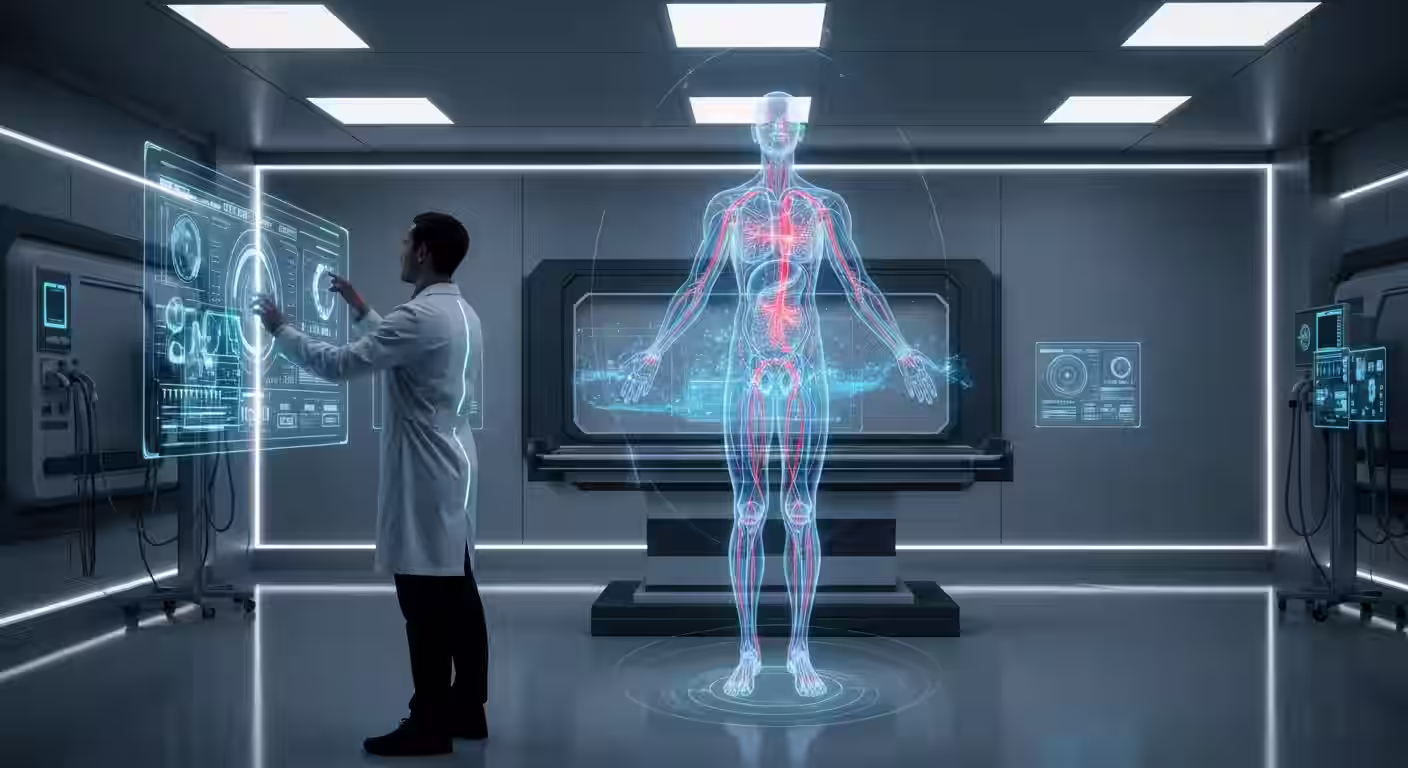 Al centro, un digital twin umano fluttuava in forma olografica: un corpo traslucido, attraversato da linee di dati che pulsavano con il ritmo di un cuore virtuale.